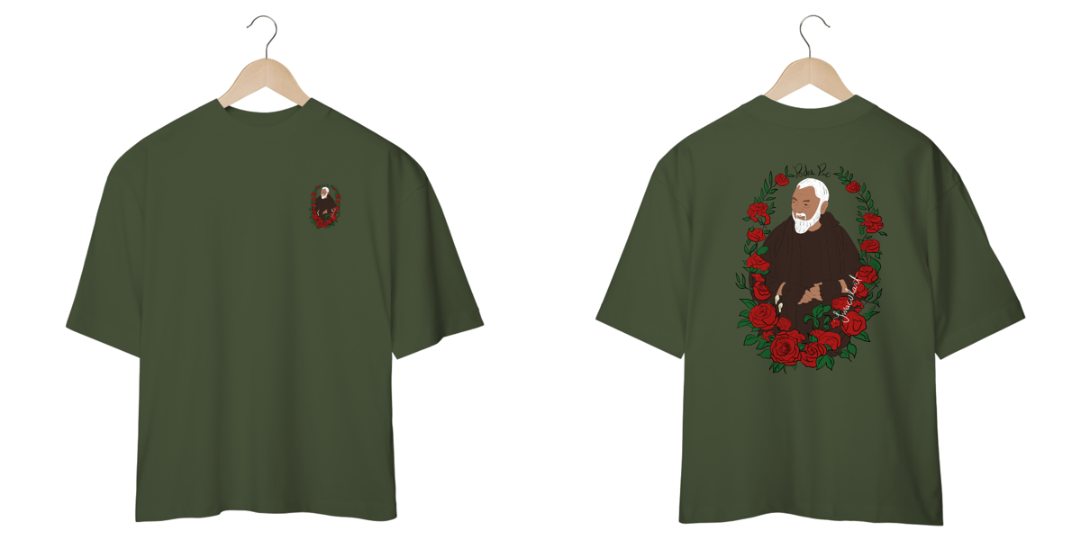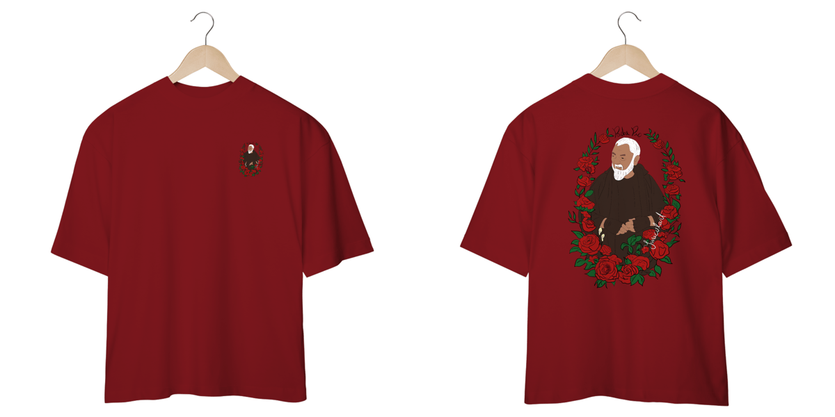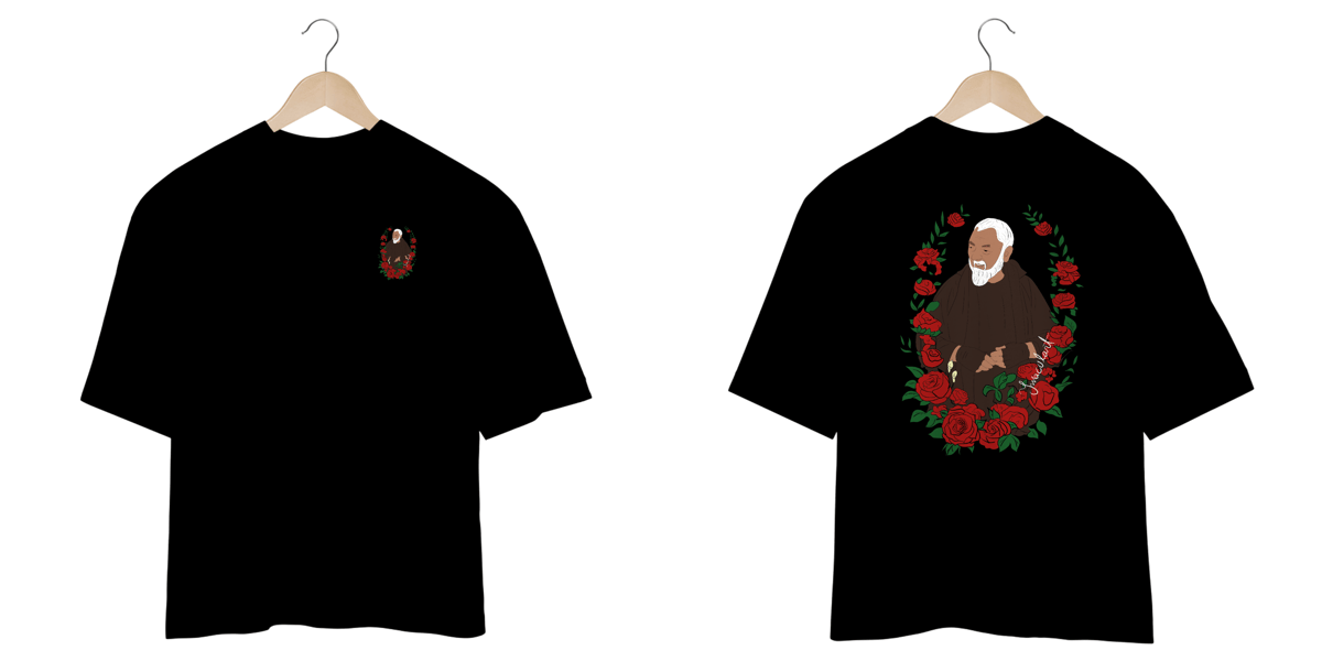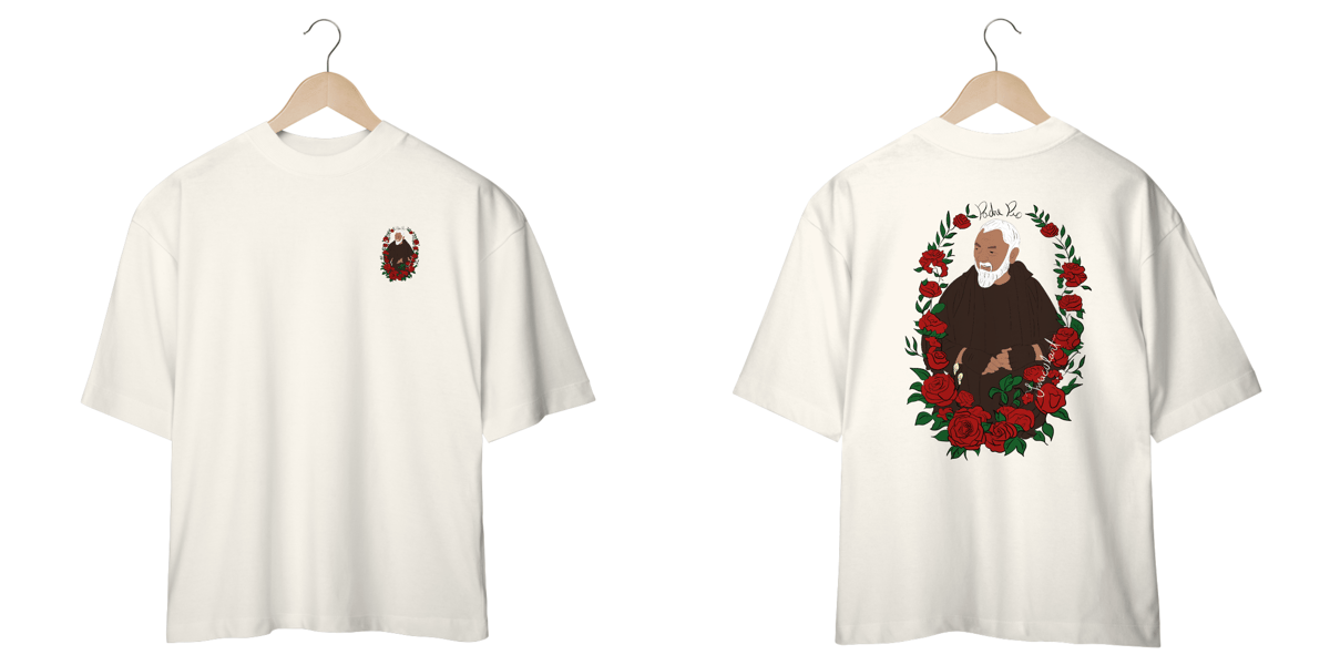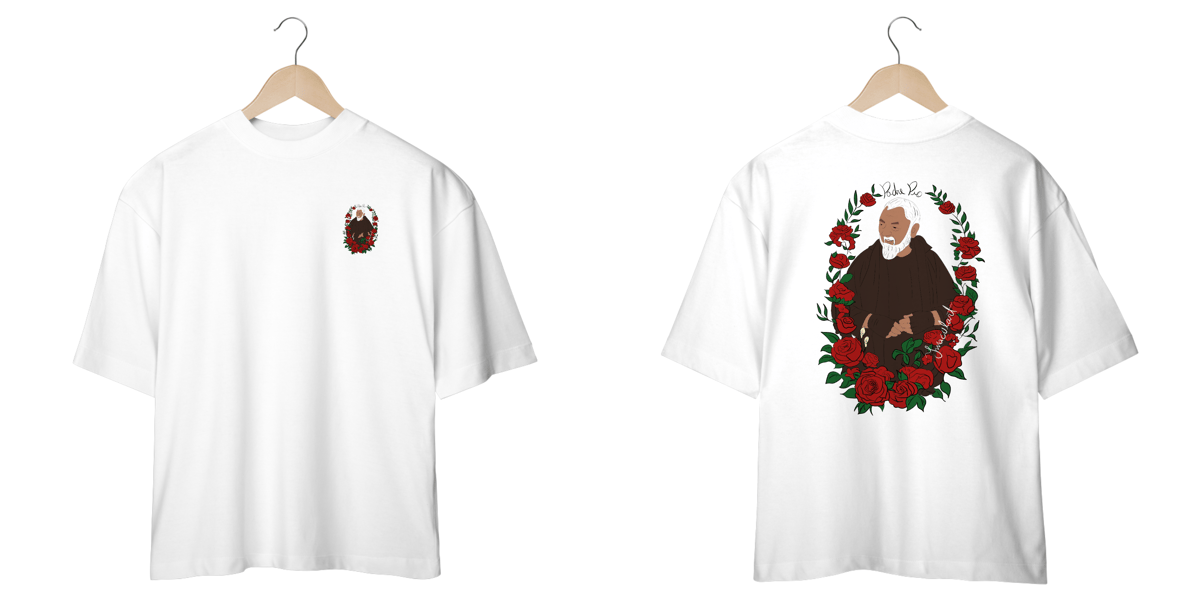 Conforto, fé e estilo se encontram nesta camiseta oversized 100% algodão, trazendo uma ilustração exclusiva de São Padre Pio rodeado por rosas, um símbolo de sua intercessão e amor divino. Com traços minimalistas e um toque artístico, essa peça une espiritualidade e moda de forma única.