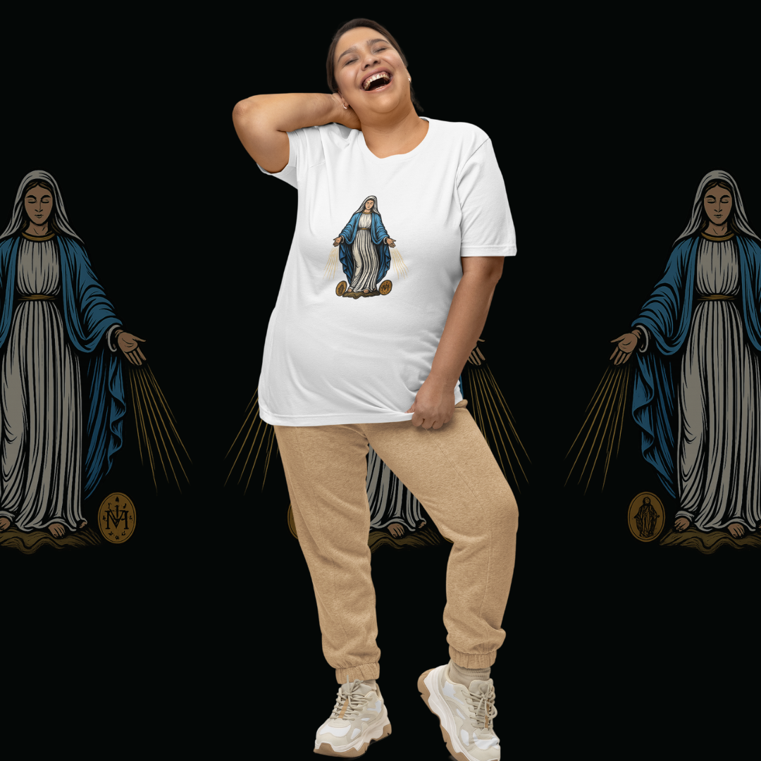 Essa estampa traz Nossa Senhora das Graças como nos tradicionais ícones católicos: de braços abertos, raios de bênçãos e as medalhas milagrosas aos seus pés — tudo em uma composição artística que une fé e beleza com profundidade.