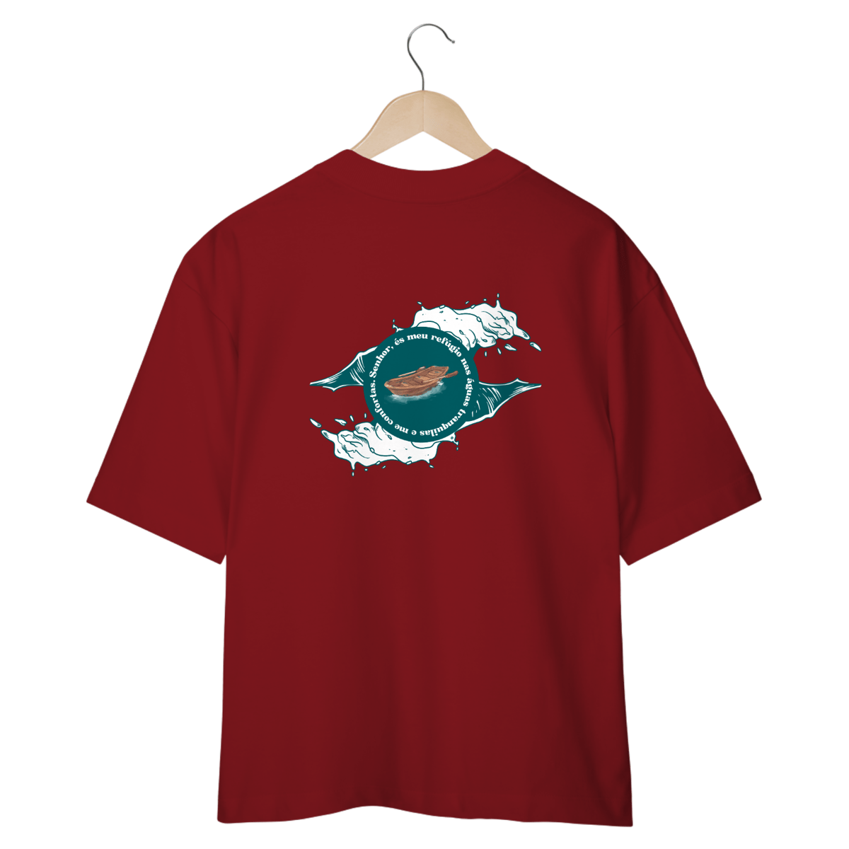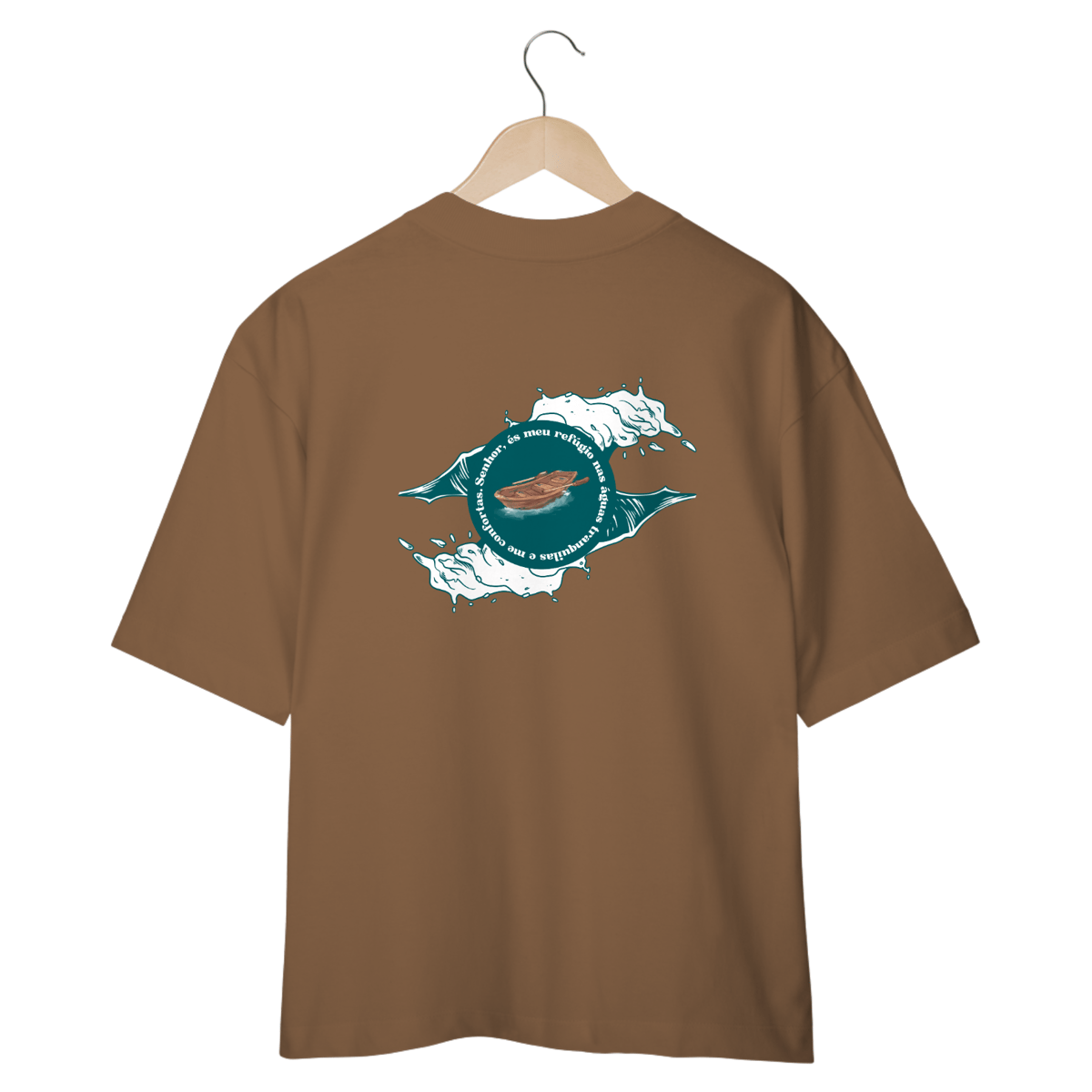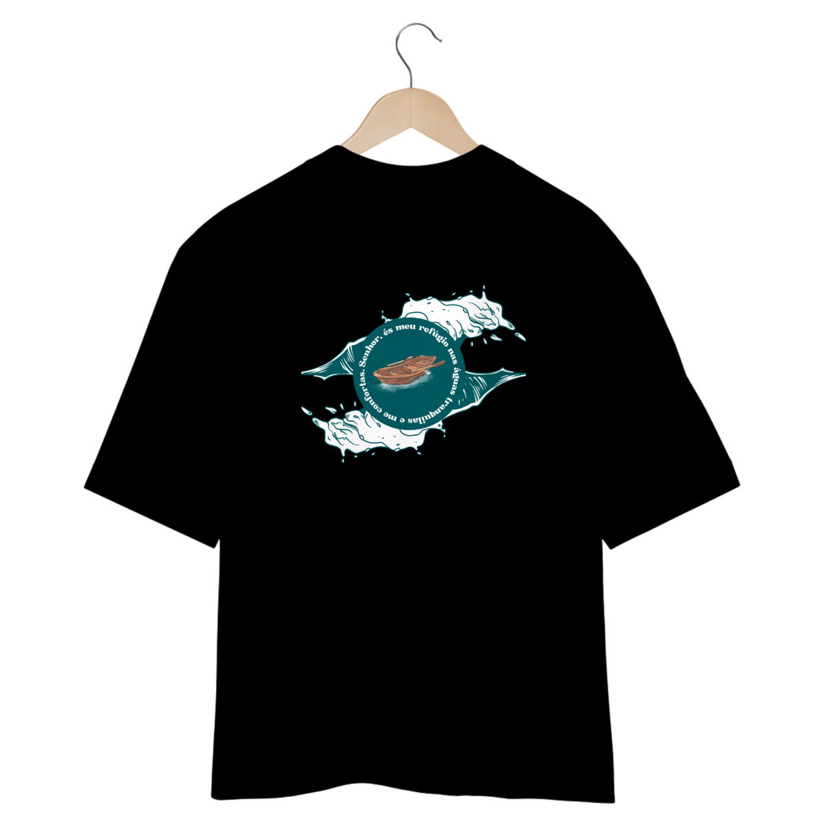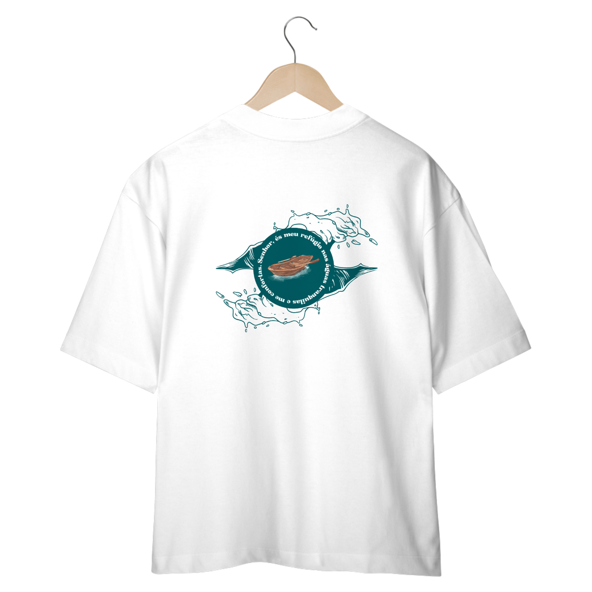 Nas costas da camiseta, essa cena é um abraço. E na frente, uma pequena onda — discreta, mas cheia de significado — lembra que o mar existe, mas não nos engole quando o nosso abrigo é Deus.