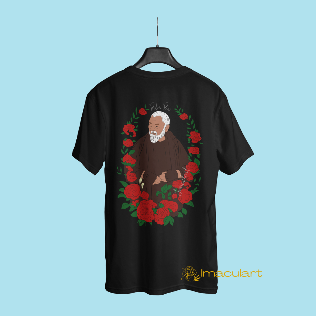 Ilustração exclusiva de São Padre Pio rodeado por rosas, um símbolo de sua intercessão e amor divino. Com traços minimalistas e um toque artístico, essa peça une espiritualidade e moda de forma única.